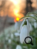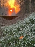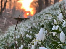 Auf dem Rückweg kam ich an einem Feld mit blühenden Schneeglöckchen vorbei während die riesige orange-rote Sonnenscheibe unter dem Horizont verschwand.