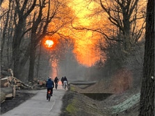 Auf dem Rückweg kam ich an einem Feld mit blühenden Schneeglöckchen vorbei während die riesige orange-rote Sonnenscheibe unter dem Horizont verschwand.